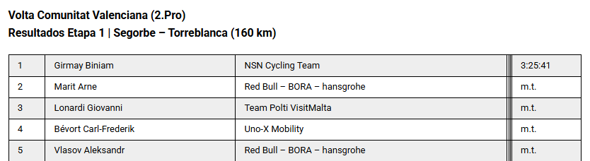 En un final a pura velocidad, Biniam Girmay (NSN Cycling Team) ganó en el inicio de Vuelta a la Comunidad Valenciana 2026. El africano, quien era un claro favorito para llevarse el triunfo, fue el más rápido al sprint de un reducido pelotón, luego de una fracción llana de 160 kilómetros con salida en Segorbe y llegada a Torreblanca.